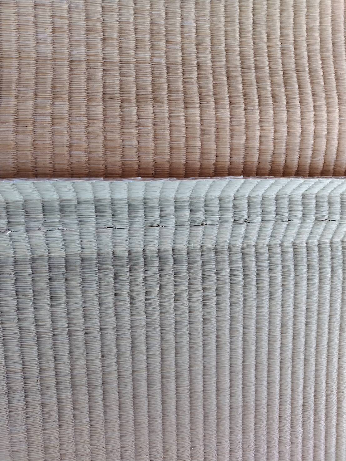 今日のお仕事は国産八代表畳の張り替えです。今回は裏返しせずに新しく交換です。お客様は10年前に新築で畳を敷いたと仰っていました。八代表は、高級品ですが裏返しをすれば、ここまで綺麗に裏返しできます。今回はお客様の要望により、新規に新しい畳表の張り替えました。