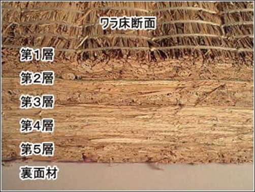 【わら床】畳床は、良質な稲ワラを4層から5層に重ね、約40cmまでつみ重ね5cmまで圧縮して作られています